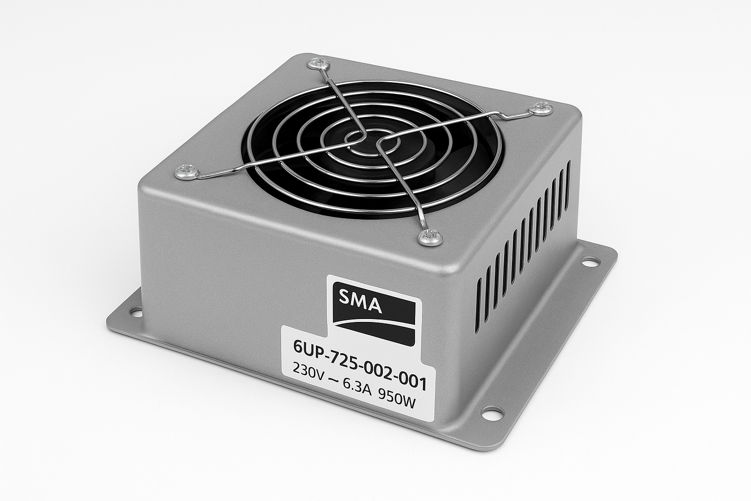 The SMA 6UP-725-002-001 Axial Fan Heater is a precision-engineered spare part designed for reliable temperature regulation in SMA Solar-, Battery-, and Electrolysis Power Conversion Units. This 230V fan heater provides 950W of heating power with a current rating of 6.3A, ensuring stable operation and efficient performance in demanding environments.