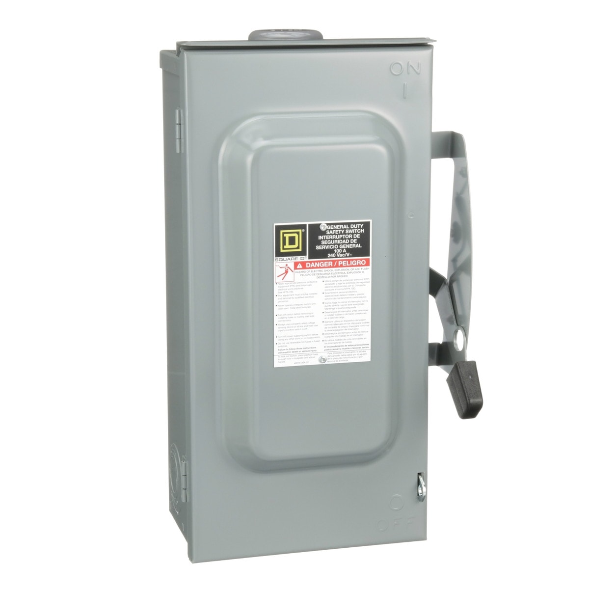 General duty safety switches are designed for residential and commercial applications where durability and economy are prime considerations. Typical loads include lighting, air conditioning, and appliances. They are suitable for use as service equipment when equipped with a factory installed neutral assembly or field installed service grounding kit. This general duty single throw safety switch is a two pole, 100A, fusible disconnect with a 240VAC voltage rating. This switch has a factory installed neutral and a NEMA 3R enclosure and is surface mounted. This safety switch accepts H, K, or R fuses. This switch comes with lugs suitable for aluminum or copper conductors. These general duty switches are UL listed.