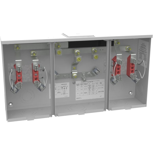 The 4-Term RNGLS LRG CLS PLT 2 Pos SGL Conn is a 200 Amp heavy-duty electrical connector solution designed for robust power distribution applications. With its large ringless cover plate and two-position single connection design, it supports conductor sizes from 6 AWG to 350 KCMIL, ensuring reliable and secure electrical connections in demanding environments.