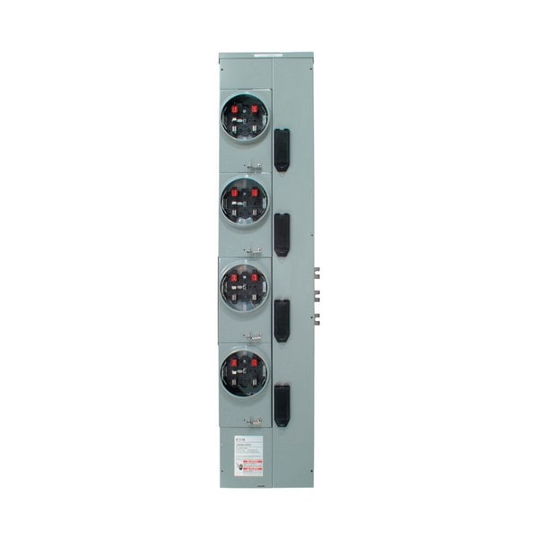 Eaton's Three-Phase Residential Meter Stack Module is a high-performance and reliable solution designed for group metering applications. Rated for 200A with an 800 Ampere aluminum bus, this meter stack module is perfect for outdoor installations in residential or light commercial environments. It features five jaws and four sockets, providing flexibility for multiple metering setups. The unit is designed with a no-bypass feature, ensuring enhanced security. With a ringless security cover, it offers reliable protection against tampering and unauthorized access. The module is configured for three-phase input and single-phase output, with a voltage rating of 120/208V.