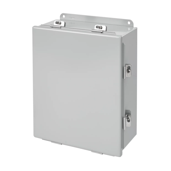 The Junction Box, Steel, Type 4 Continuous Hinge is designed to offer reliable protection for electrical components in outdoor or rugged environments. Constructed from durable steel with a gray polyester powder paint finish, it provides excellent protection against water and dust ingress. This enclosure features a continuous hinge for secure access and is bracket-mounted for easy installation. With dimensions of 12 inches in width, 14 inches in length, and 6 inches in height, it is ideal for industrial applications.