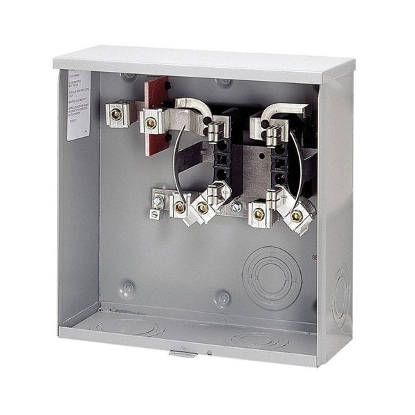The Eaton Meter Socket is designed for residential service applications, offering reliable and secure metering in a compact configuration. With a 200A amperage rating, it supports 1-position residential service and is equipped with a 4-jaw, single-phase design. The socket accommodates wire sizes ranging from 6-350 Kcmil and includes a horn bypass for added convenience during service interruptions. Featuring a solid top and ringless design, this meter socket is suitable for three-wire, triplex connections, and includes a ground connection for copper wiring. Rated for 600V AC, it ensures dependable performance in residential metering systems.