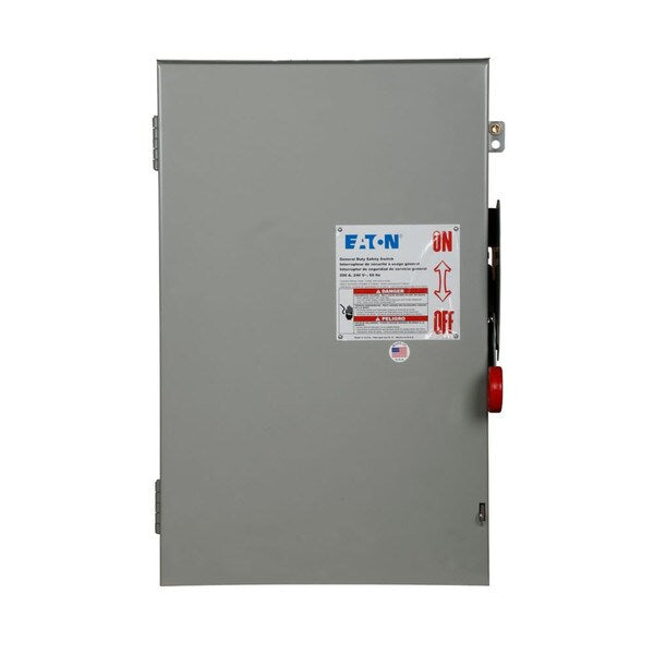 The Eaton General Duty Non-Fusible Safety Switch is designed to provide reliable and safe disconnect protection in both residential and commercial applications. With a 200A rating and a two-pole, two-wire configuration, this switch is perfect for use with 240V systems. Constructed from painted galvanized steel, the switch features a NEMA 3R rainproof enclosure, making it suitable for outdoor use and protecting it against environmental elements such as rain and dust. The non-fusible design allows for easy operation, offering a simple and reliable solution for disconnecting electrical circuits.