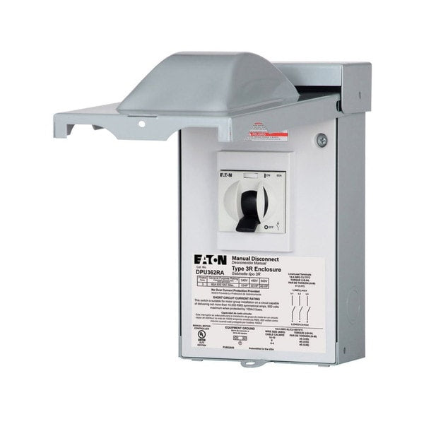 The Air Conditioning Disconnect Switch is designed for reliable disconnection of high-power appliances. With a 60A capacity, this switch supports both 240V and 480V applications and is ideal for 3-phase systems. Constructed from galvanized steel, the enclosure ensures durability and resistance to harsh weather conditions. The switch is non-fusible, with wire sizes ranging from 14 to 4 AWG (Cu/Al 60°C or 75°C), providing flexibility for various installation needs.