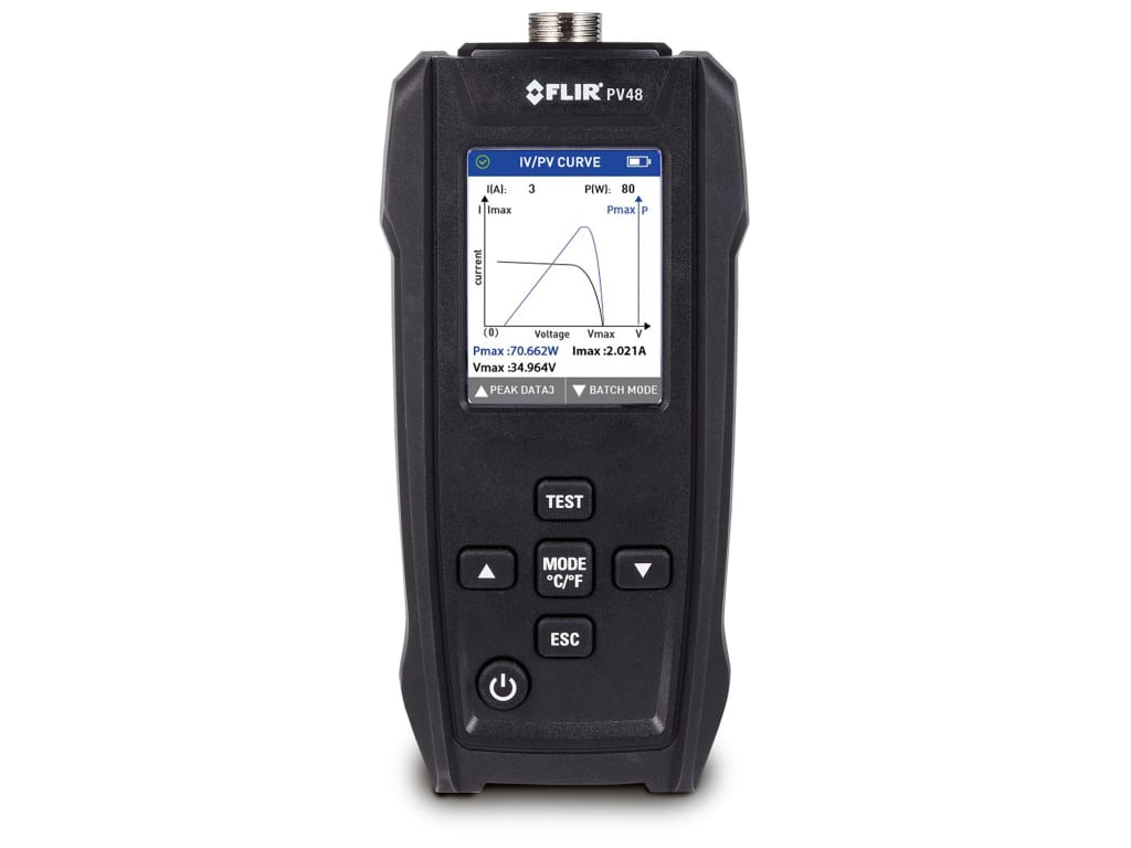 The FLIR PV48 is a reliable, easy-to-use tool for capturing vital solar panel performance data in the field. Whether you're commissioning new installations or troubleshooting underperforming panels, it provides instant, visual I-V diagnostics backed by accurate metrics and built-in convenience.