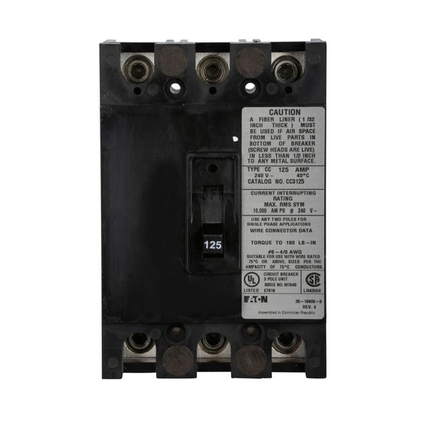 The Type CC Molded Case Circuit Breaker is a high-performance three-pole breaker designed to provide superior protection in electrical systems. With a 150 A rating and 10 Kaic short-circuit interrupting capacity, this breaker is ideal for residential and commercial applications. It is rated for 240 V systems and can accommodate wire sizes from 4 to 4/0 AWG copper or aluminum conductors, suitable for both 60°C and 75°C temperature ratings.
